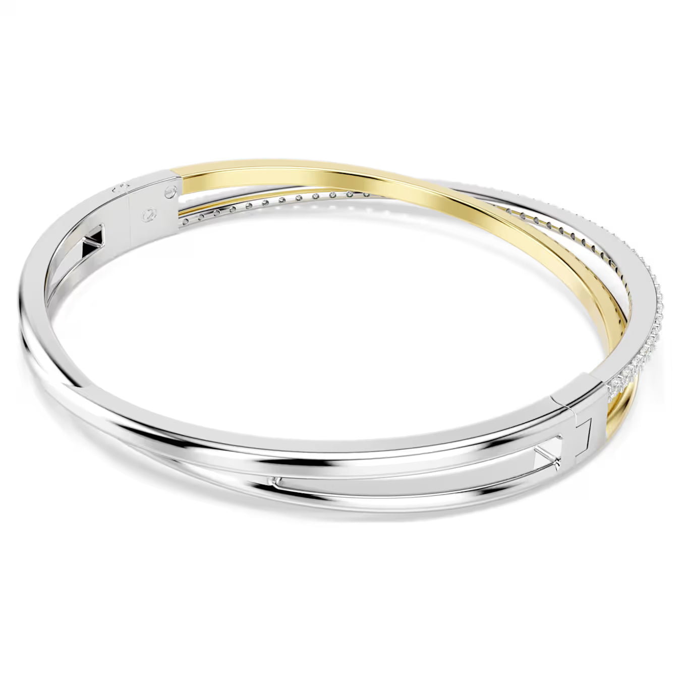 • This twisting Hyperbola bangle is crafted with unmistakable Swarovski savoir-faire. The two overlapping bands are presented in a mix of gold-tone and rhodium plating, with round Swarovski Zirconia placed in a prong setting. An elegant way to inject intrigue into any outfit.