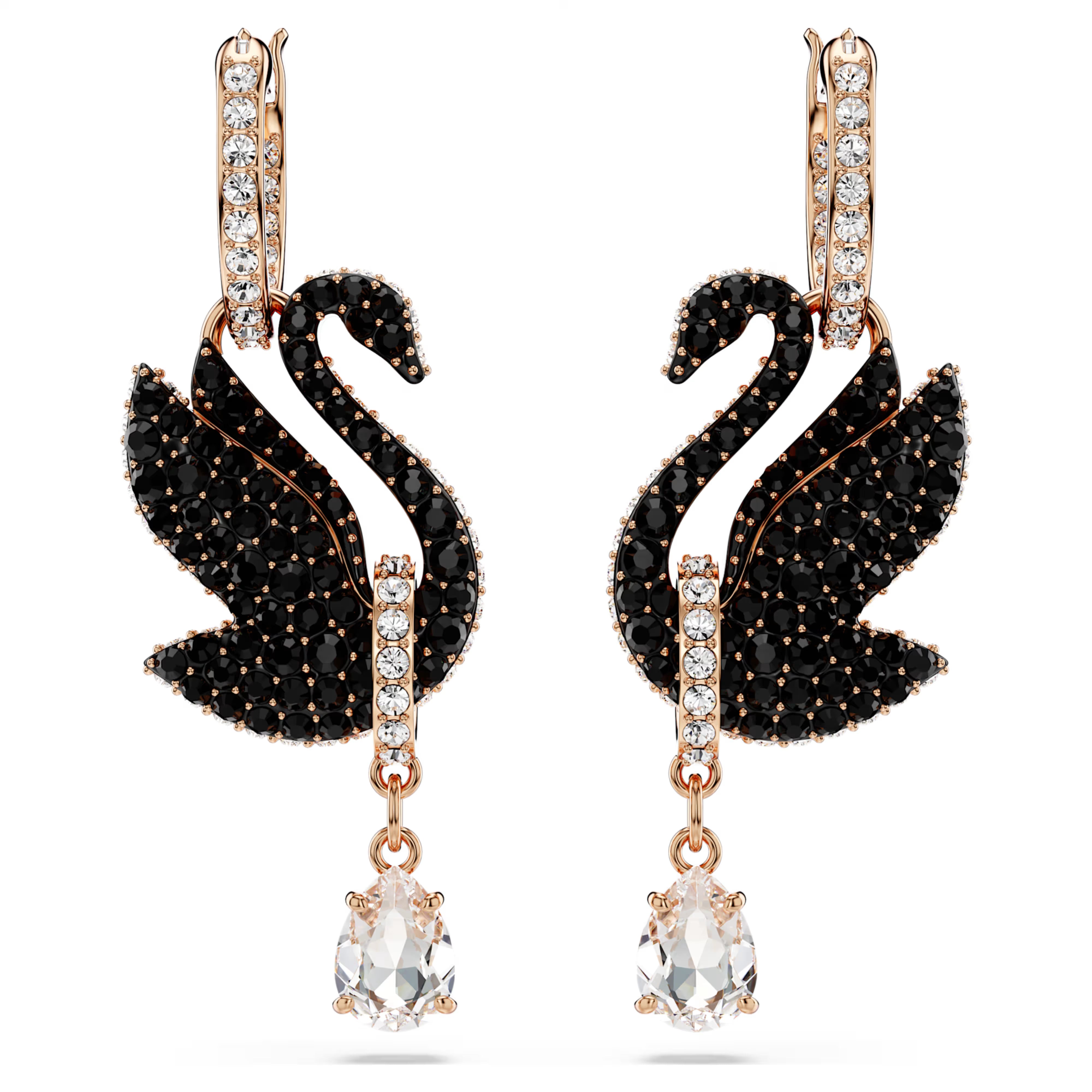 Swar*vski -Swan drop earrings Swan, Black, Rose gold-tone plated-5678047