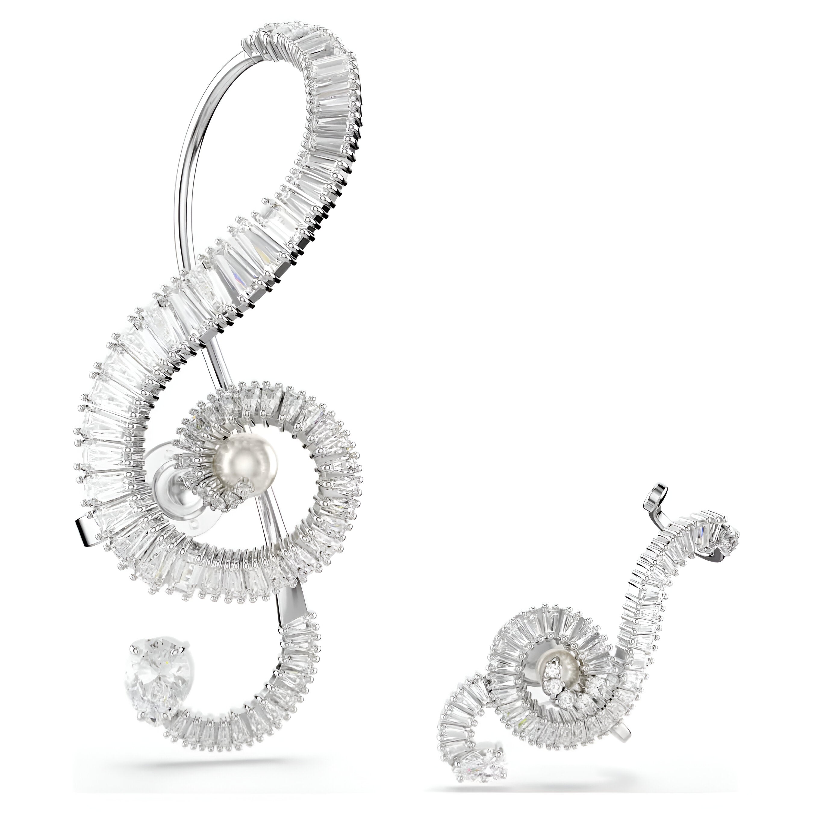 • These asymmetrical music-inspired clip earrings will inject any outfit with rhythm and light. Taking the form of a treble clef in two different sizes, each rhodium plated piece is elegantly tapered and set with baguette-cut Swarovski Zirconia. For an extra dose of pure star power, a single Swarovski Crystal Pearl is then placed at the center. Gift these earrings to a talented musician or wear to make your own heart sing.