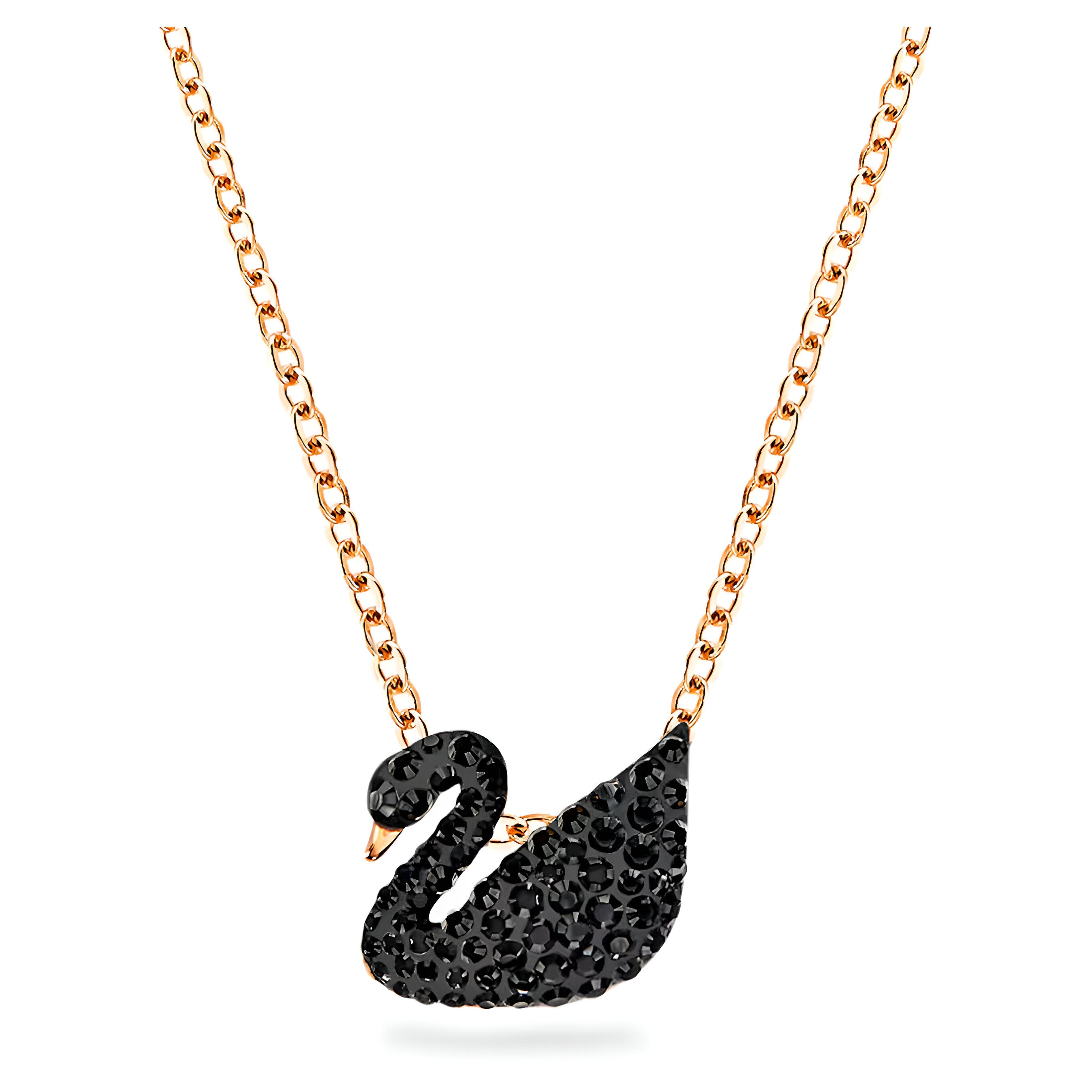 • A modern take on an iconic piece, this pendant captures the grace and elegance of a swan. It combines rose gold-plated metal and black crystal pavé. Perfect for adding a soft sparkle to any outfit. The pendant measures 2 x 1.5 cm and comes on a 38 cm rose gold-plated chain.