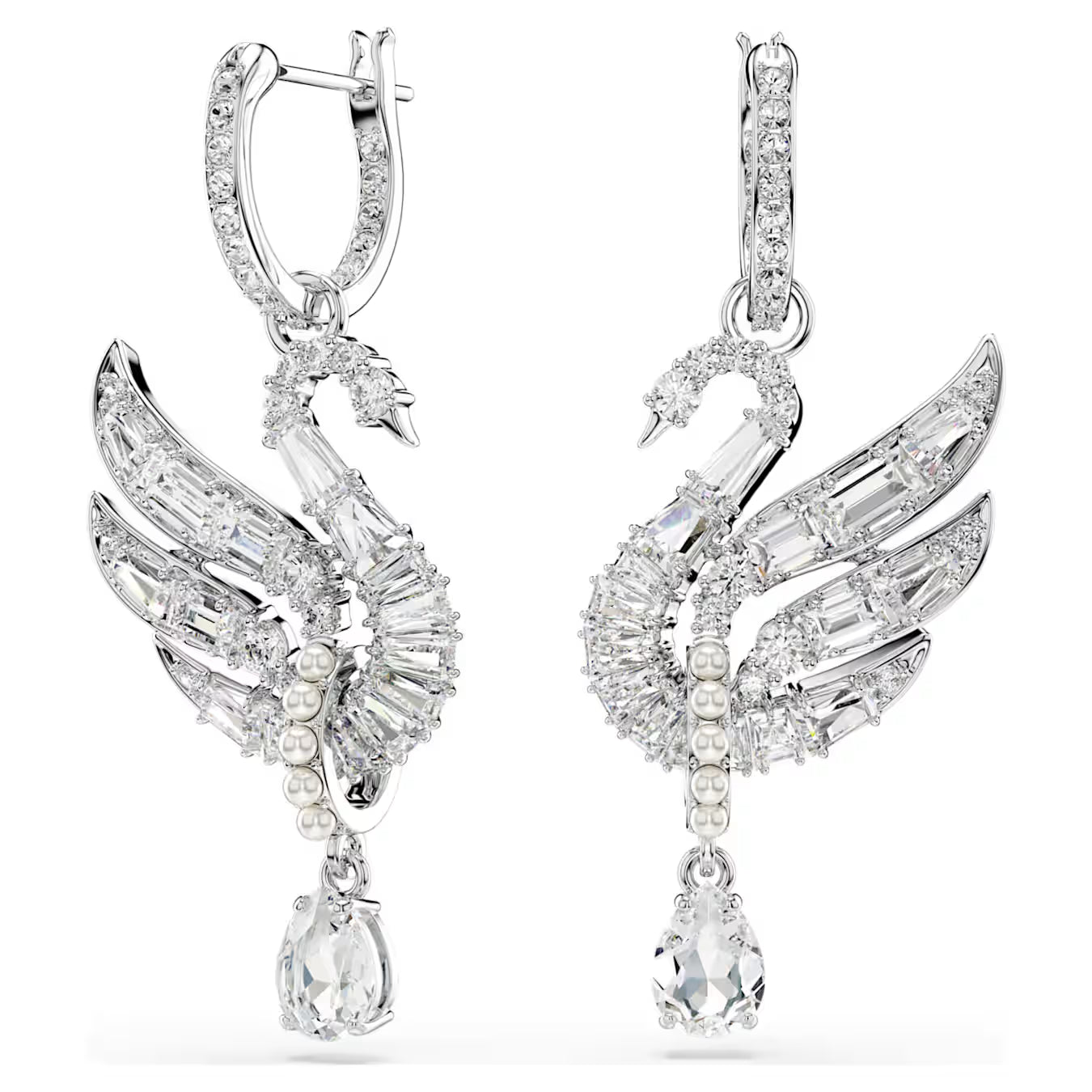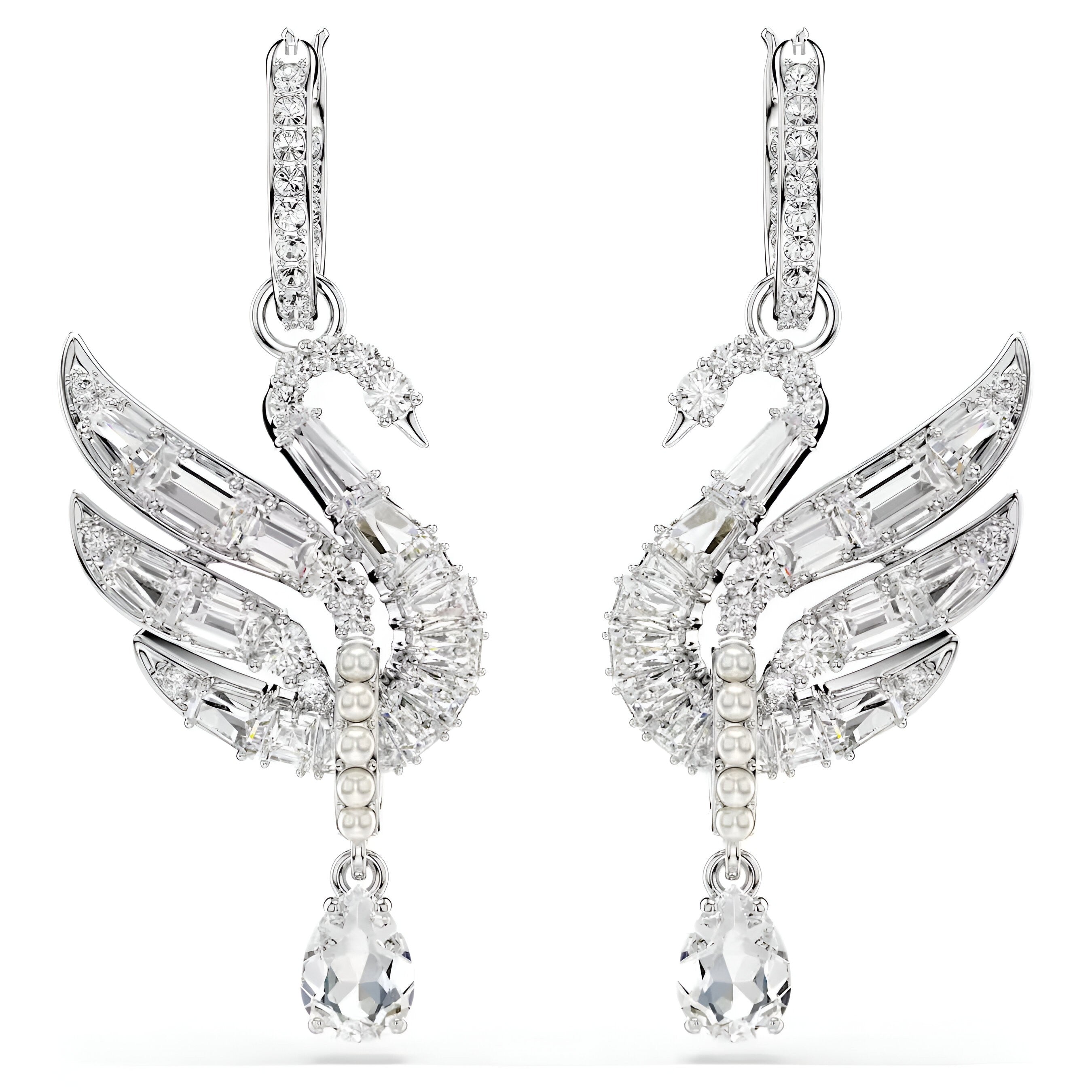 • Joyful, elegant, and radiant, these earrings are a celebration of the iconic Swarovski swan. Attached to a mini pavé hoop, each rhodium plated piece is adorned in clear Swarovski Zirconia and features a single pear cut that hangs from a pavé hoop of Swarovski Crystal Pearls. Wear them alongside the matching pendant for a look of pure sophistication.