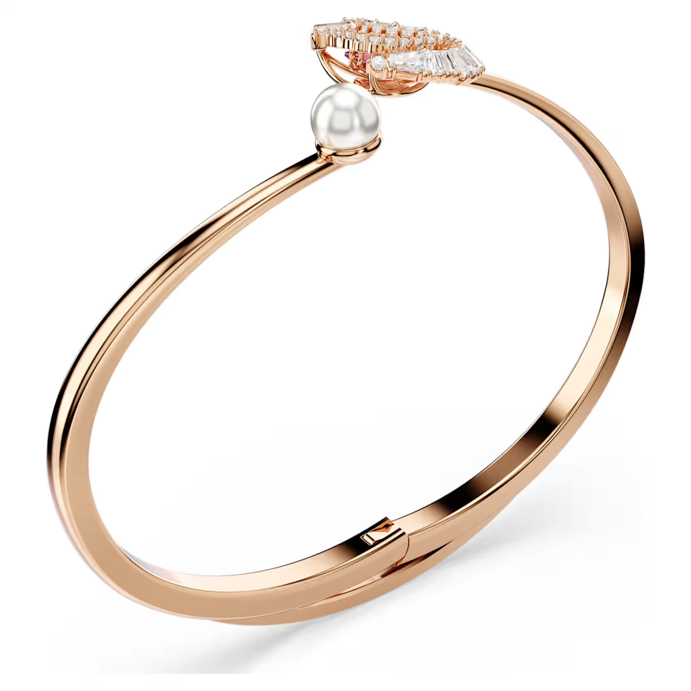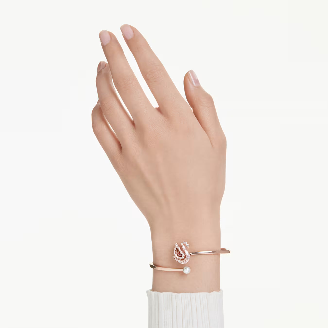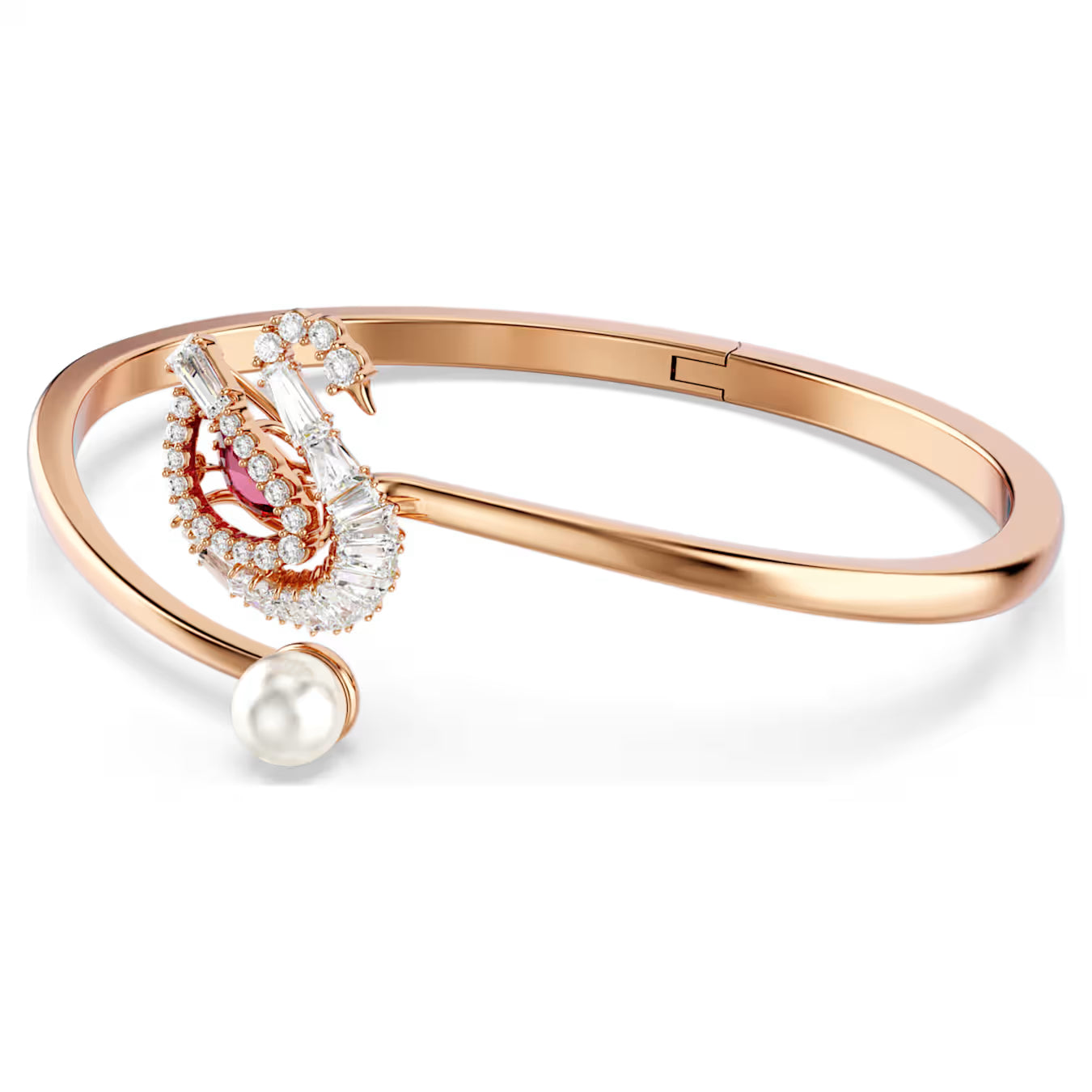 • The Swarovski swan is an emblem of love, joy, and eternal beauty. In this rose gold-tone plated bangle, those qualities are conveyed through a graceful silhouette adorned in clear Swarovski Zirconia with a red dancing stone in a swan body cut. The tapered band also features a single Swarovski Crystal Pearl for a delicate touch of luxury. Wear this bangle with the matching pendant to exude elegance at every hour.
