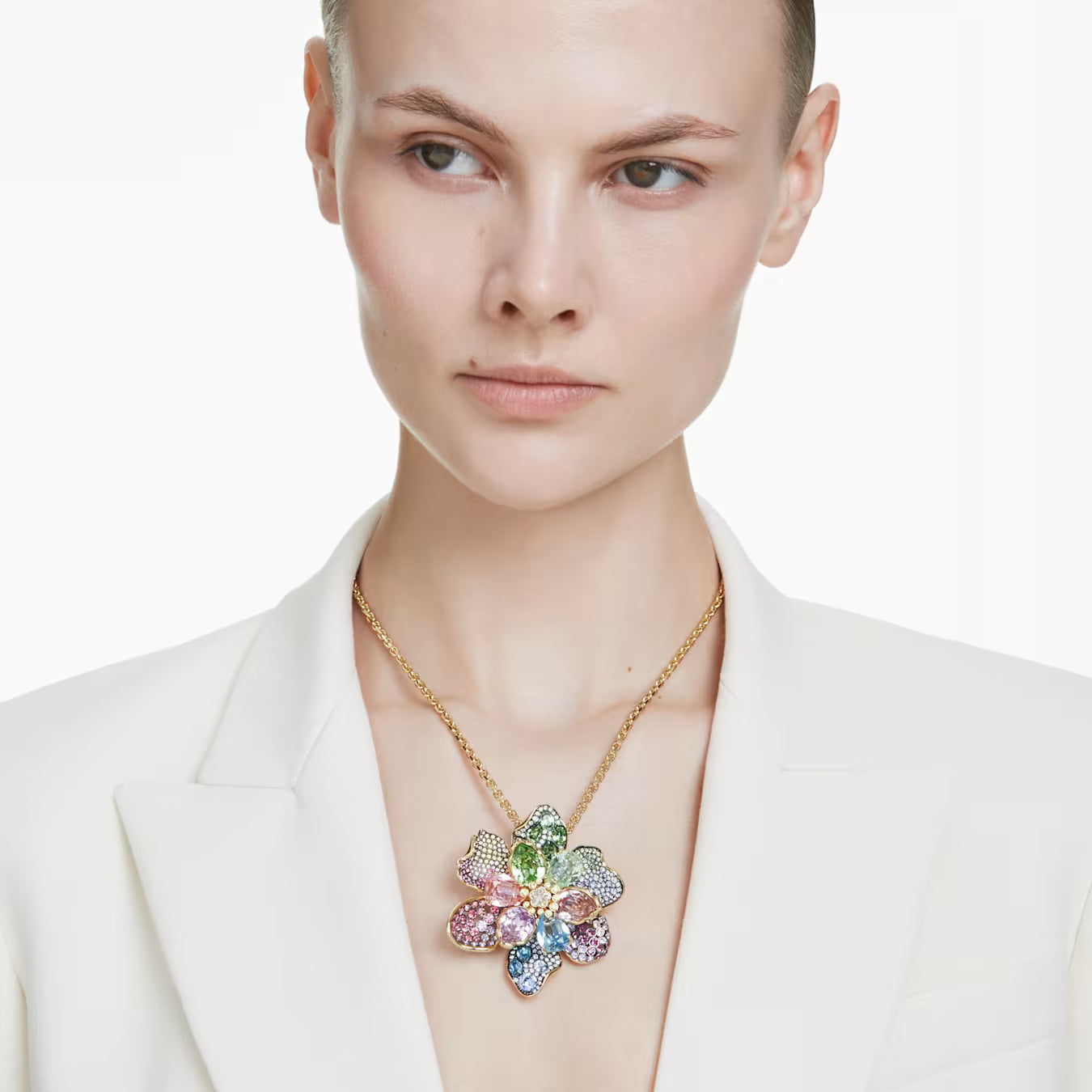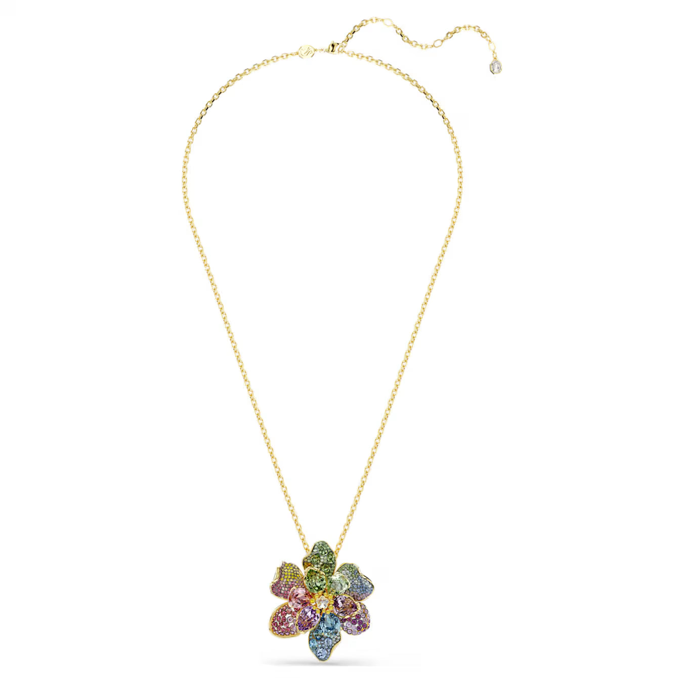 • Embrace the collision of color in this nature-inspired pendant. Expertly crafted using all of Swarovski’s finest savoir-faire, including pavé, Pointiage™, and chatonnage techniques, the showstopping design features an array of crystals in multiple shapes, shades, and sizes, resulting in a wondrous flower motif that forever stays in full bloom. The jewelry is suspended from a gold-tone plated chain and also has the versatility of being worn as a brooch.